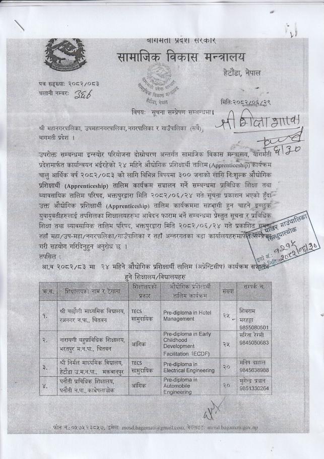 सामाजिक विकास मन्त्रालयको सूचना सम्प्रेषण सम्बन्धमा।