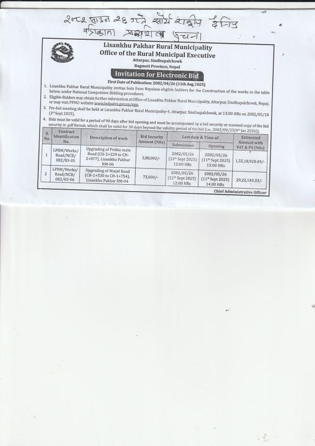 पेट्कु मुख्य सडक स्तरोउन्नती वडा नं. ६ र निन्जेल सडक स्तरोउन्नती वडा नं. ४ को वोलपत्र आह्वान सम्बन्धी सूचना।