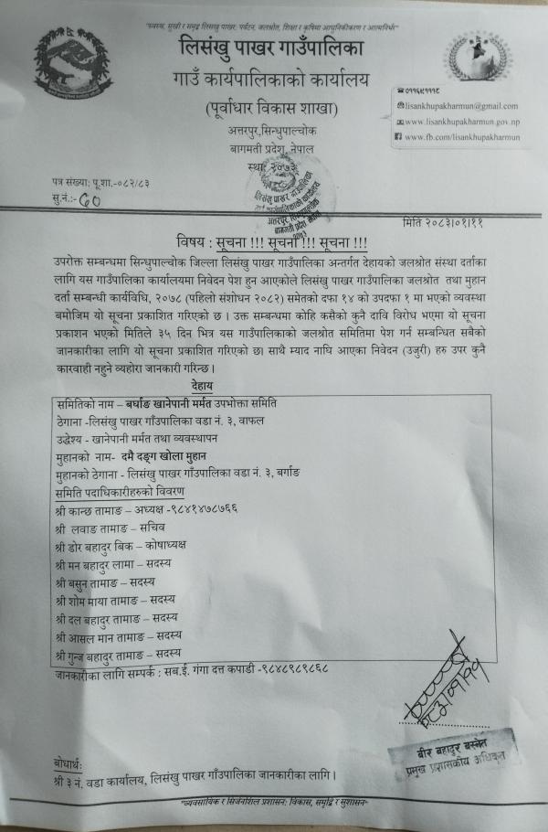बर्गाङ खानेपानी मुहान दर्ता सम्बन्धी सूचना