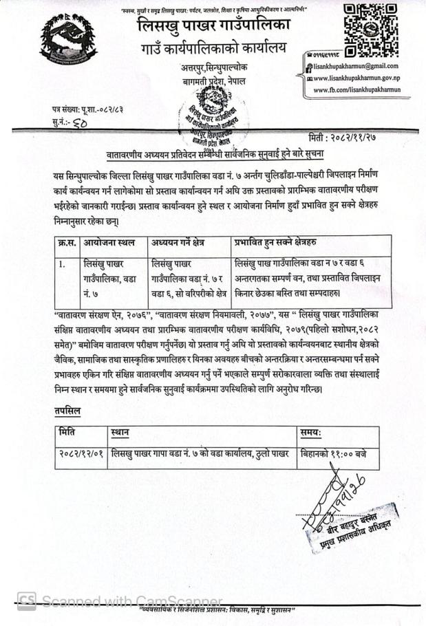 वातावरणीय अध्ययन प्रतिवेदन सम्बन्धी सार्वजनिक सुनुवाइ हुने बारे सूचना
