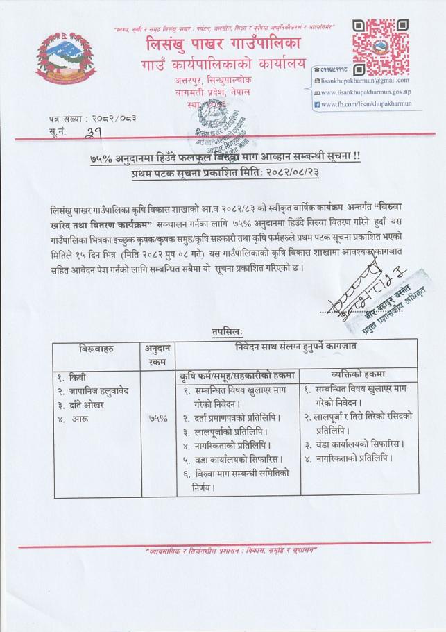 ७५% अनुदानमा हिउँदे फलफूल विरुवा माग आह्वान सम्बन्धी सूचना।